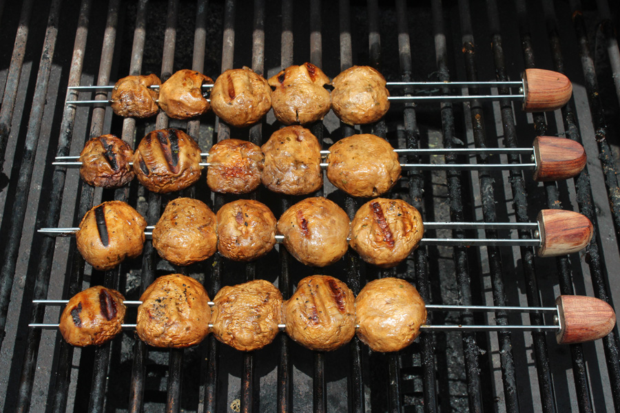 - Turn the direct heat down to medium and lay the skewered mushrooms, cap-side down, on the grill. Cook for 3 to 5 minutes per side or until golden and well marked. Transfer to cutting board or serving platter. I like to remove the mushrooms from the skewers and quarter them to serve over the steak.