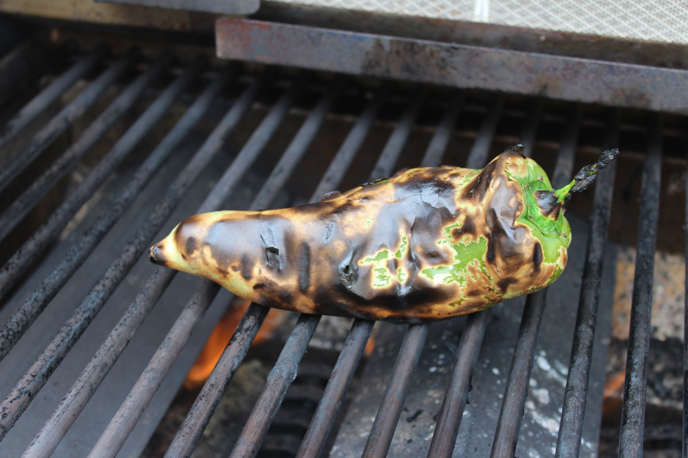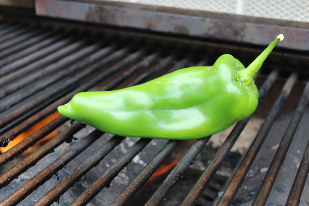 - If you are using a fresh chile, roast the chile over high heat on the grill or on the burner of your stove until is is charred all over. Place in a brown bag or seal in a container until it cools. Peel away the skin; remove stem and seeds, then dice.