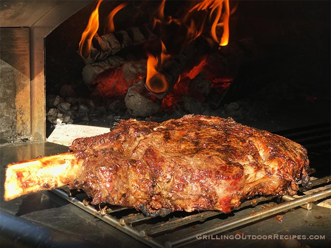 Watch the meat carefully, turning over to get an even char on both sides of the steak. Once the steak has a nice sear/char, set the steak and rack aside outside the pizza oven. - Roasting the meat: Using the shovel, move the embers/coals back into the corner of the pizza oven. Place the steak on the rack in the opposite corner. Roast the steak until done to desired temperature.