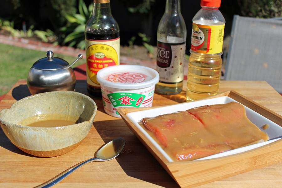 - Lightly salt the fish and let it sit for 5 to 10 minutes. Blot away any moisture with paper towels and place fish in a container that just holds the fish or in a a resealable plastic bag. Stir together the miso, mirin, vinegar, sugar, and soy sauce. Pour the marinade over the fish, cover and place in the refrigerator to marinate for at least a couple hours and as long as 24 hours. Remove fish from marinade about 30 minutes prior to cooking and lightly wipe away excess marinade with your fingers; do not rinse.