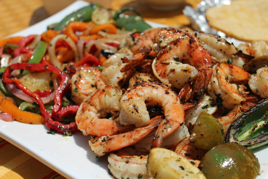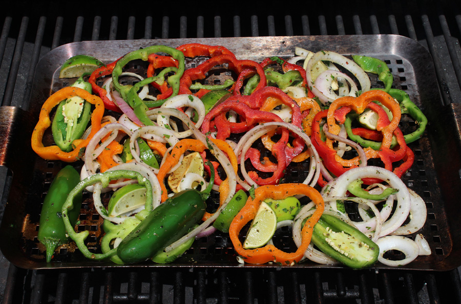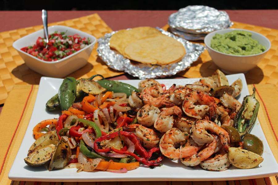 - Grill onions and pepper until soft; about 5 to 6 minutes, turning often. Transfer to a serving platter and cover with foil to keep warm. Close the grill cover and wait a couple minutes to allow the grill to heat back up. Once heated, re-oil the grates or grid. Add the packets of tortillas to the grill to heat; turn every couple minutes until heated through. At the same time, place the shrimp on grill and cook for 2 to 3 minutes per side (depending on the size) or until the shrimp are opaque; do not overcook. Transfer shrimp to serving platter. Serve hot with warmed tortillas, grilled limes, and salsa.