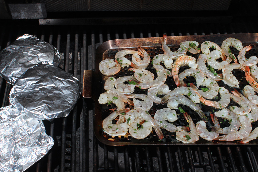 I cook the whole meal on a grill grid for the convenience of not chasing food that fall between the grates. You may want to skewer the shrimp for the ease of flipping them – I don’t because they cook so fast and I can move them around the grid to accommodate any pieces that are cooking more or less quickly. Wrap the tortillas with foil in bunches of five with foil and warm them on the grill while your are cooking the shrimp.