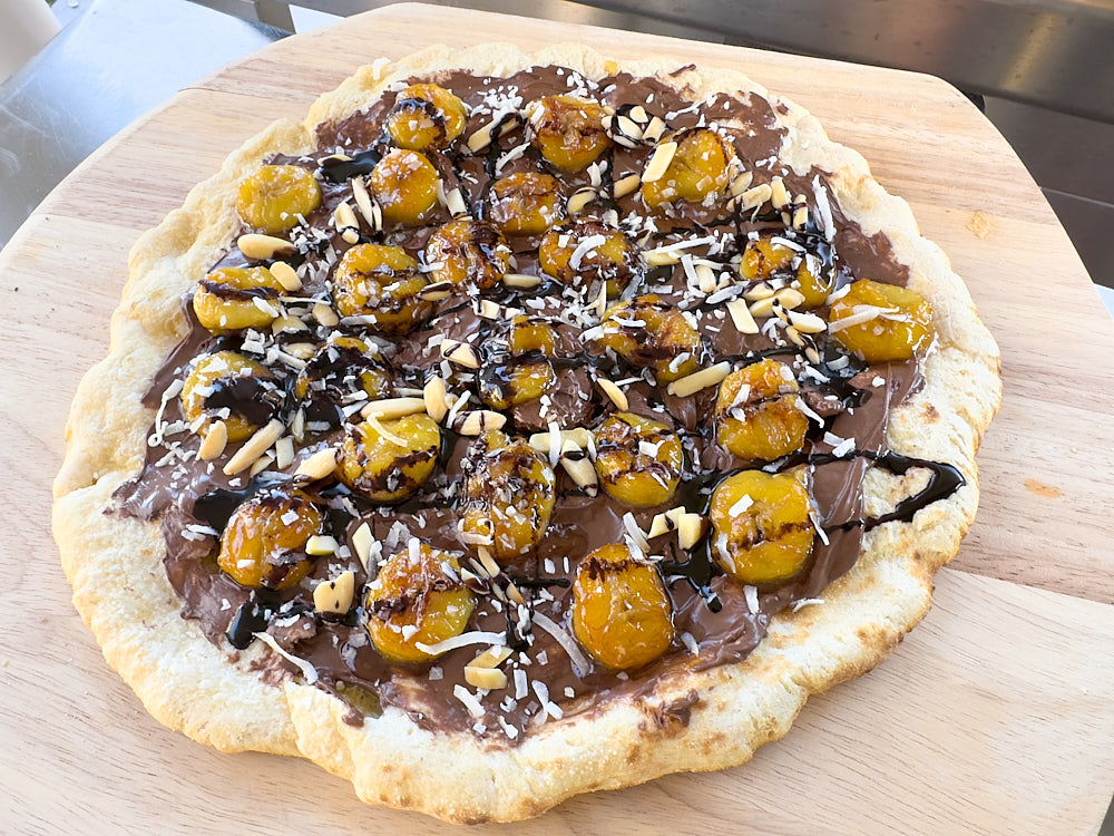 - Spread the hazelnut spread over the pizza, followed by the bananas and sauce. Top with nuts and chocolate sauce. Place the pizza back in the Bull Pizza Oven for 10-20 seconds to warm the toppings, then remove.