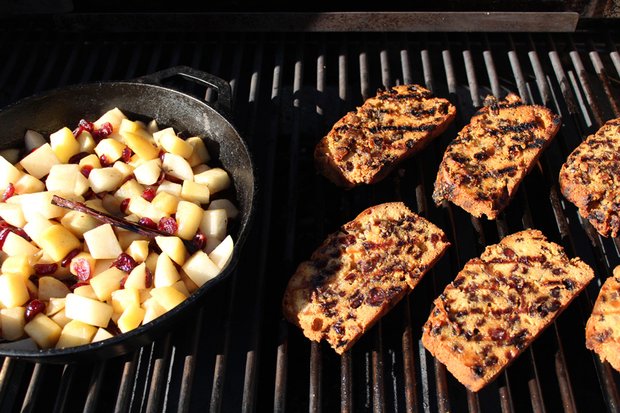 - For the fruitcake: set up grill for direct cooking over medium heat. Melt the butter together with the brandy in a small saucepan. Swirl the pan to combine. Brush both sides of the fruitcake slices with the brandy-butter. Be sure the grates of the grill are clean and well-oiled. Grill both sides of the fruitcake until toasted and well marked. Transfer to dessert plates and top the fruitcake slices with the apple-pear compote and a dollop of whipped cream. Great Aunt Millie would be pleased.