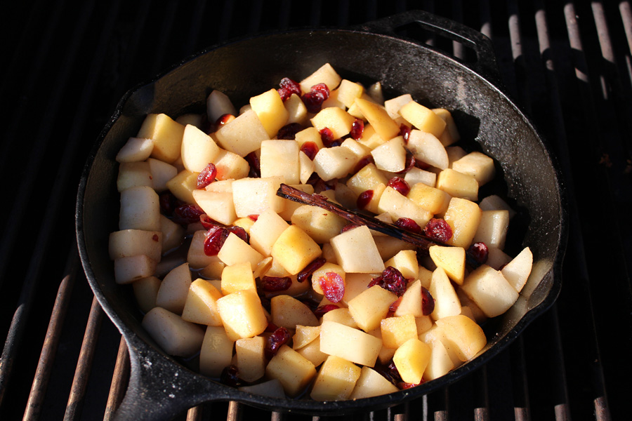 - For the compote: on the the grill in a cast iron skillet or on the stove top, combine all of the compote ingredients and bring to a simmer. Cook, stirring occasionally, until the apples and pears are tender; about 15 to 20 minutes. Move to the side to keep warm.
