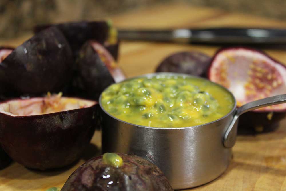 I prefer to make lemonade and sweetened drinks with simple syrups rather than straight up sugar. For one reason, the sugar is already dissolved for you. Plus simple sugars, because they are a cooked syrup have a little deeper flavor that sugar on it’s own. This morning I had every intention of writing a recipe for blueberry lemonade. When I went to the fridge to get the blueberries, there were six beautifully ripe lilikoi or passion fruit that I had left over from a photo shoot last week… it’s like the sun came-a-shinin’! So I cut those beautiful wrinkled gems in half and scooped out the pulp.