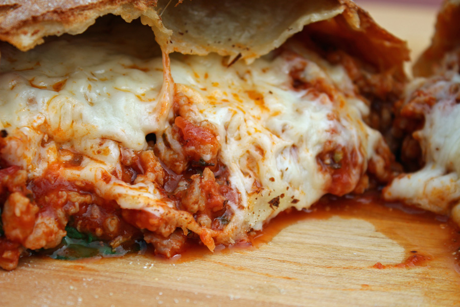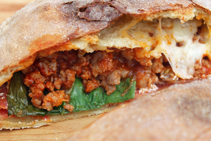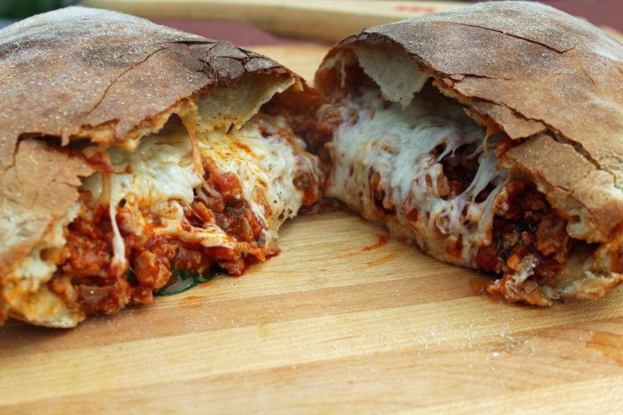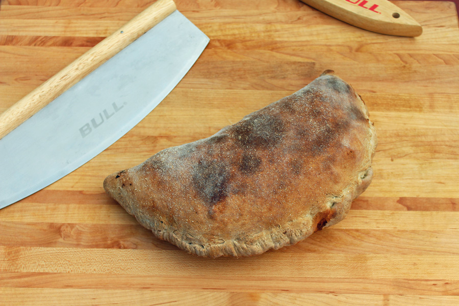 This calzone is not for the meat-phobic! I originally made it for dinner the other night with ground buffalo and calabrese salami. I also had some black garlic and sliced that up and used in place of the black olives. So delicious! Use a pizza stone and let it get hot for 20 to 30 minutes for best results. This pie is too heavy to set directly on the grill, but you could always set it on a small sheet pan and cook with indirect heat.