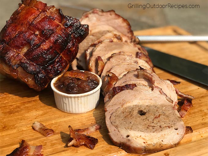 Rotisserie Stuffed Bacon Wrapped Pork Loin with English Chutney