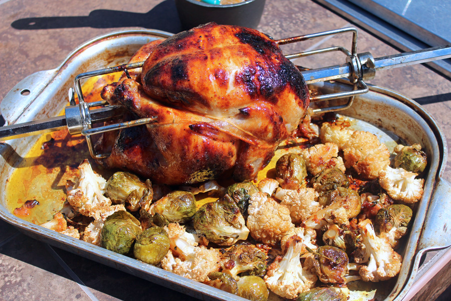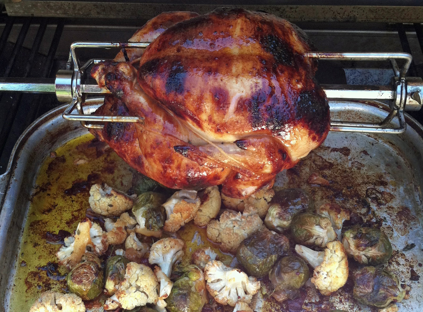 - Situate the chicken and the rotisserie and start the motor. Close the grill cover and cook for 15 minutes. Meanwhile, toss the vegetables with Bull Rub. After 15 minutes, add the seasoned vegetables and thyme sprigs to the drip pan and then baste the chicken liberally; close cover and continue cooking. Baste chicken every 15 minutes thereafter until the chicken is cooked. The chicken is done when it is no longer pink at the bone and the juices run clear (165°F for breast halves; 180°F for thighs). Remove the chicken and let rest for 10 minutes on the spit before removing. Remove the drip pan and vegetables; transfer vegetable with a slotted spoon and keep warm until ready to serve.