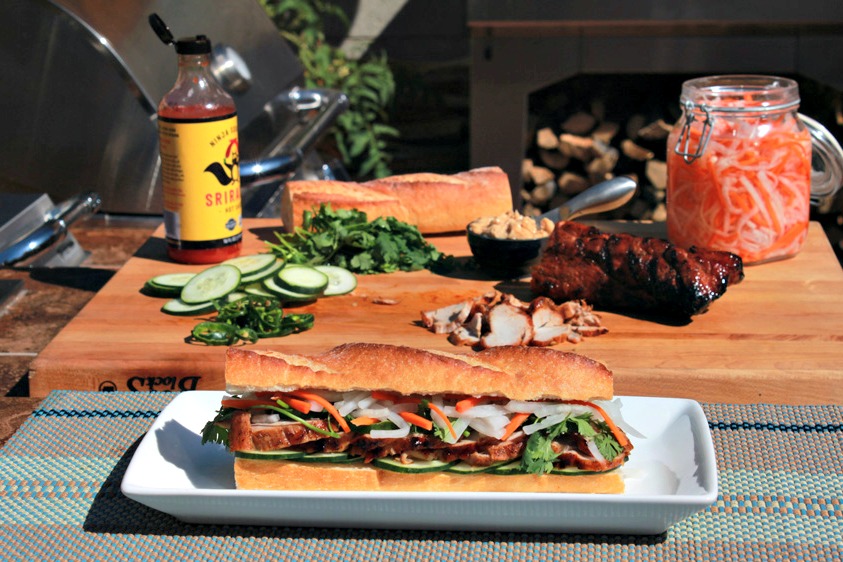 - For sandwich: split open baguettes (toast if desired) and slather both sides with soy sauce butter. Layer with cucumbers, sliced pork, jalapeños, a few sprigs of cilantro, and top with pickled daikon and carrots (the best part!).