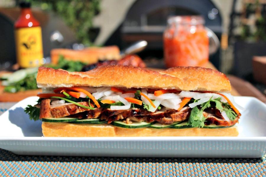 Vietnamese Bahn Mi sandwiches are truly a great mash-up of Vietnamese and French cultures. Buttered baguettes layered with roast pork, cucumbers, chilies, cilantro, and pickled daikon radish and carrots. What was once only found in Vietnamese restaurants, bahn mi are starting to appear more often here in the U.S. in sandwich shops and as a food truck concept. I love the crunch of the fresh and pickled vegetables with the slices of pork (or whatever protein being featured) on a soft buttered baguette.