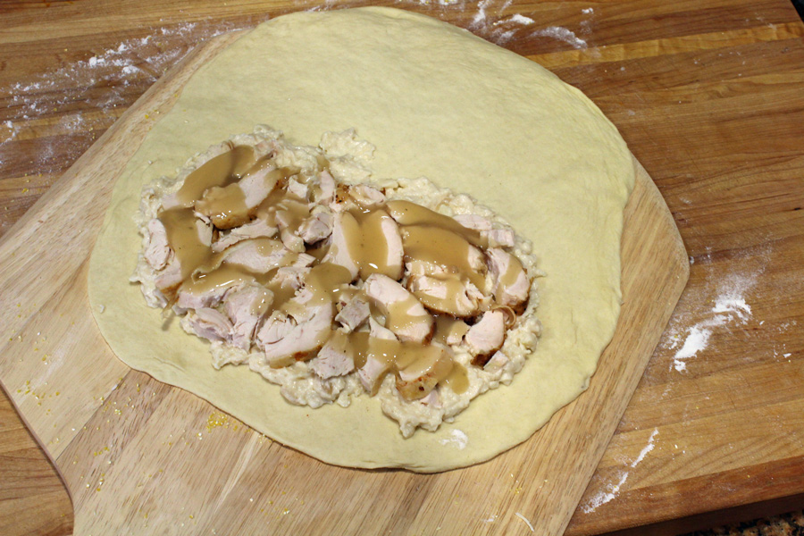 - Top with slices of turkey, spoon over some gravy, then add a thin layer of stuffing (or sweet potatoes), and a few dollops of cranberry sauce. Don't let the layers get too thick.