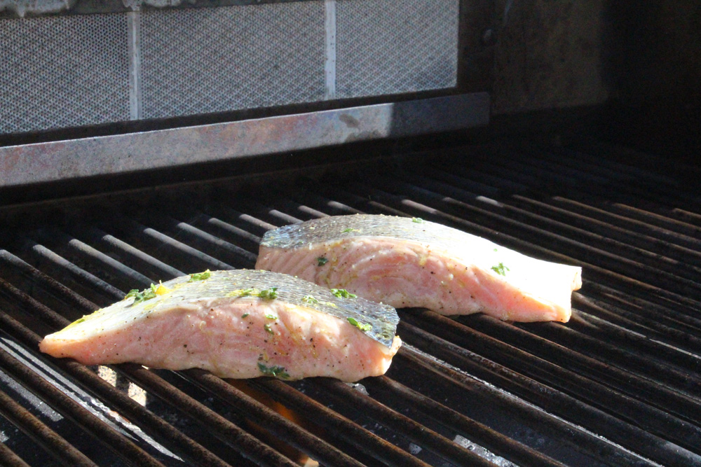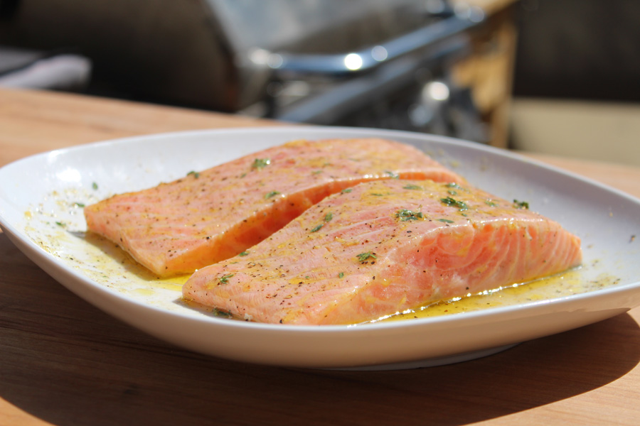 - Rinse salmon in cold water and pat dry. Juice and zest the lemon into a shallow bowl large enough to hold the salmon without a lot of extra room. Add the thyme and garlic, then whisk in a couple glugs of oil. Put salmon in to the marinade and turn to coat. Leave on the counter to marinate if you are grilling soon or cover and refrigerate for 1 to 4 hours (remove 30 minutes before grilling).